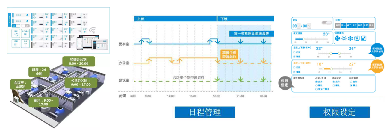 根據日常使用情況可對空調進(jìn)行日程設定,避免每日手動(dòng)開(kāi)關(guān)的繁瑣工作,更能有效減免空調忘關(guān)造成的能源浪費。而權限設定既可保持靈活的溫度調節性,又能防止無(wú)關(guān)人員隨意調控空調的情況。