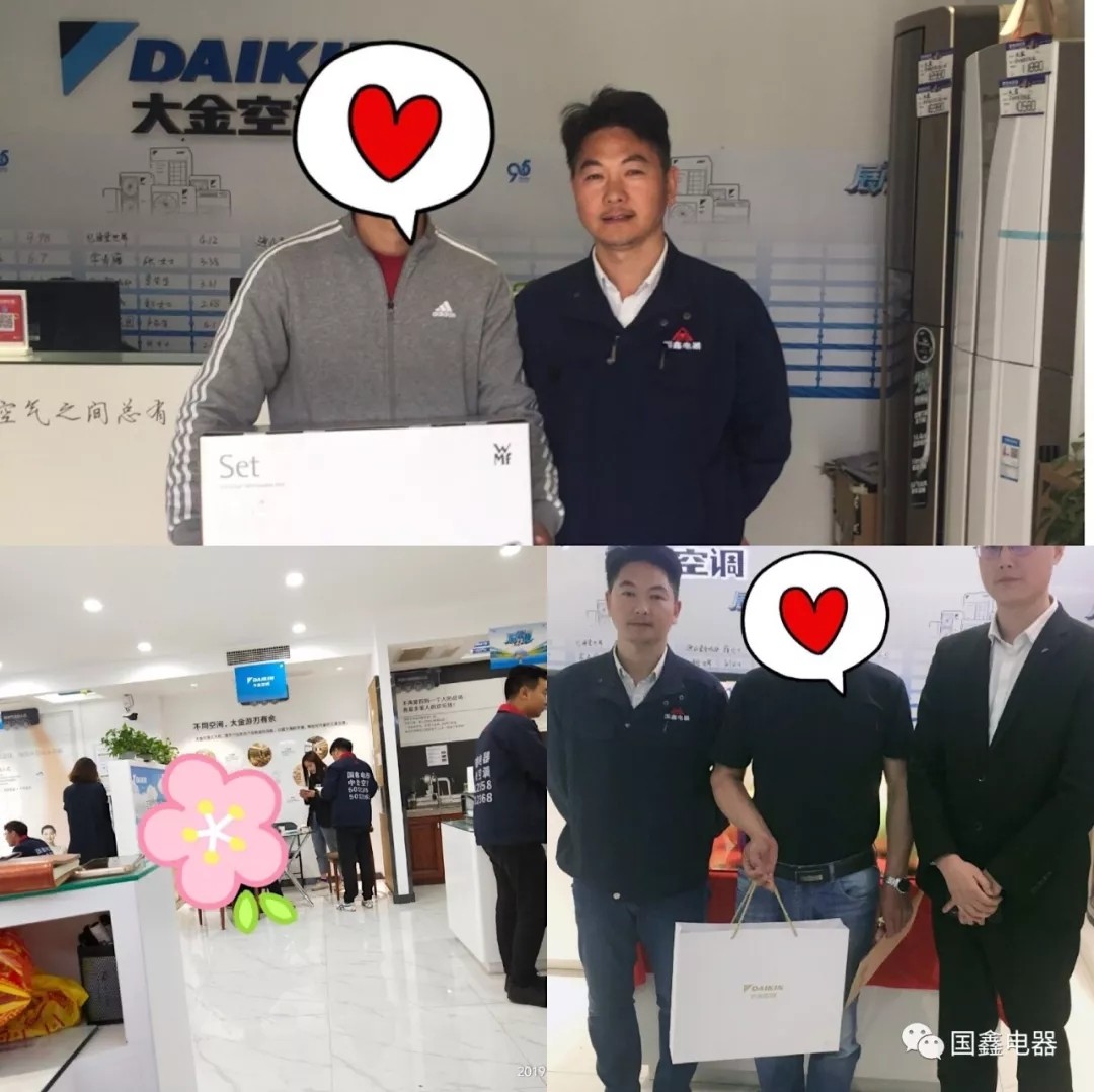 恭喜新鄉市國鑫電器在各位業(yè)主朋友、大金廠(chǎng)家領(lǐng)導的協(xié)助下,在4月19日、20日、21日三天***完成大金空調春季展廳見(jiàn)銷(xiāo)售任務(wù)。